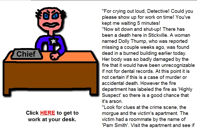 These seem to be fondly-remembered point-and-clickers from a number of years ago, but I ran into them for the first time last week. They’ve got an endearingly amateurish MS Paint style but a surprisingly grim set of scenarios, touching on arson, drugs, prostitution and domestic violence. Puzzles typically involve searching the town for clues, following up on leads and then presenting a case to the police chief. In the later games there’ll be a final chase and shoot-out with the culprit. It’s an unusual setup, not least because you actually DO have to investigate – the game doesn’t record any information for you and you have to select from a huge amount of possible evidence at the end when you present your case to the chief. Unfortunately the writing is really poor, often consisting of huge, daunting looking infodumps like the one in the picture. Still, it was an entertaining enough way to spend 15 minutes, and it’s always refreshing to not be led through a mystery game by the nose.