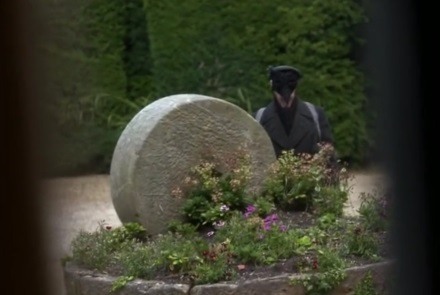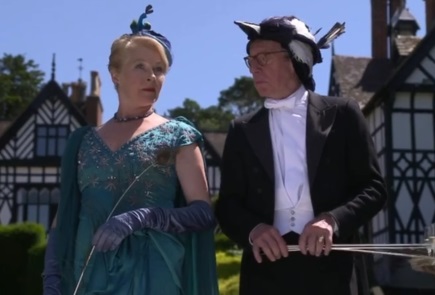 Some background: posh Lady Margaret kills a man with her car, and the victim’s son vows revenge on her and her husband, the rather wet and feeble Professor Galloway. The Galloways hold a masked treasure hunt at their estate, during which a man wearing the same mask as Professor Galloway is killed. Professor Galloway tells the police that he’s worried that he was the intended victim. Later, the masked killer shows up again outside the Galloways’ window. Professor Galloway hurries his wife into the bedroom, promising to confront the killer. Outside, Professor Galloway bumps into Father Brown, who has just driven up to the house. The killer has vanished. Father Brown and Professor Galloway search the grounds. But when they re-enter the house, they find Lady Galloway has been murdered.