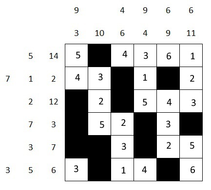 Japanese Sums – in the grid, either shade the cells or place a digit from 1 to 6. The digits cannot repeat in a row or column, but all digits do not need to appear in each row or column. The clues for each row and column represent the sum of each string of digits (or single digit) in that row/column, which must be separated by at least one shaded cell.