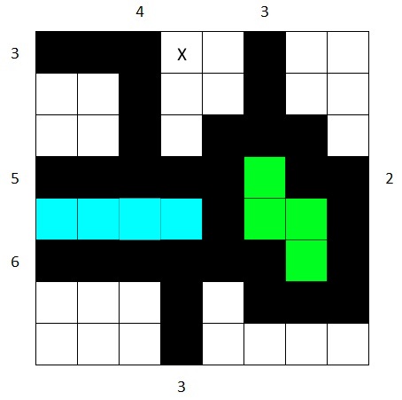 Tetrominoes – place the complete set of tetrominoes (i.e. the seven Tetris pieces) in the grid so that the number by a row or column indicates the number of empty cells before the first used tetromino is encountered. An unclued row or column means that there can be any number of empty cells, including none. The tetrominoes cannot touch each other, not even diagonally.
